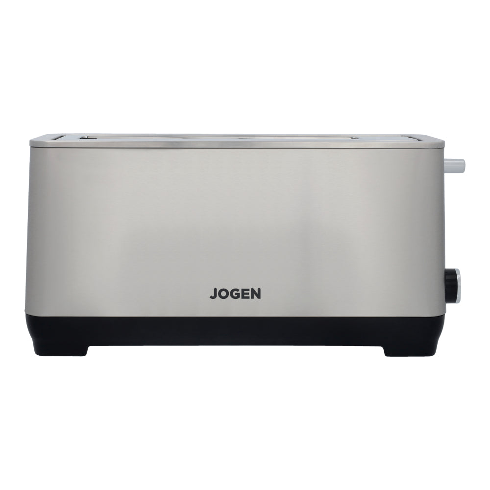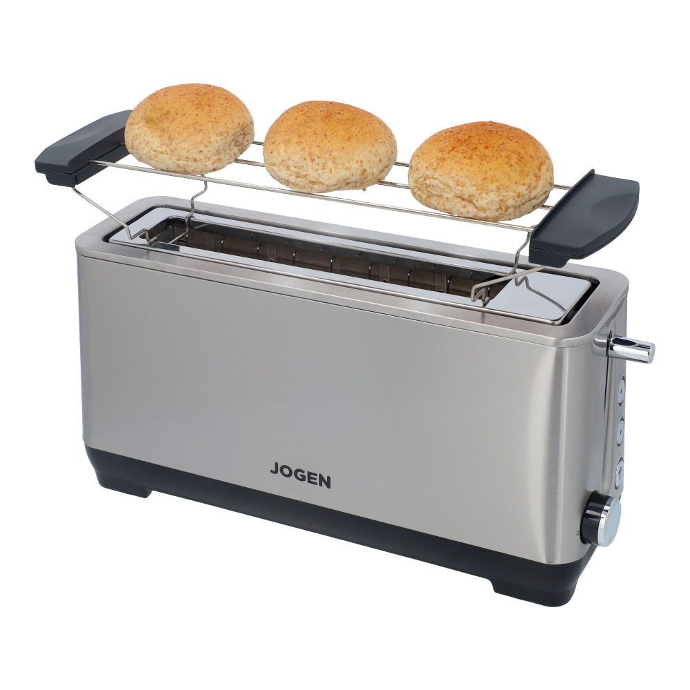 JOGEN BT 2216 pop up toaster includes a warm-up function to reheat previously toasted bread, a defroster for toasting frozen slices, and a release button to stop the toasting cycle at any time.