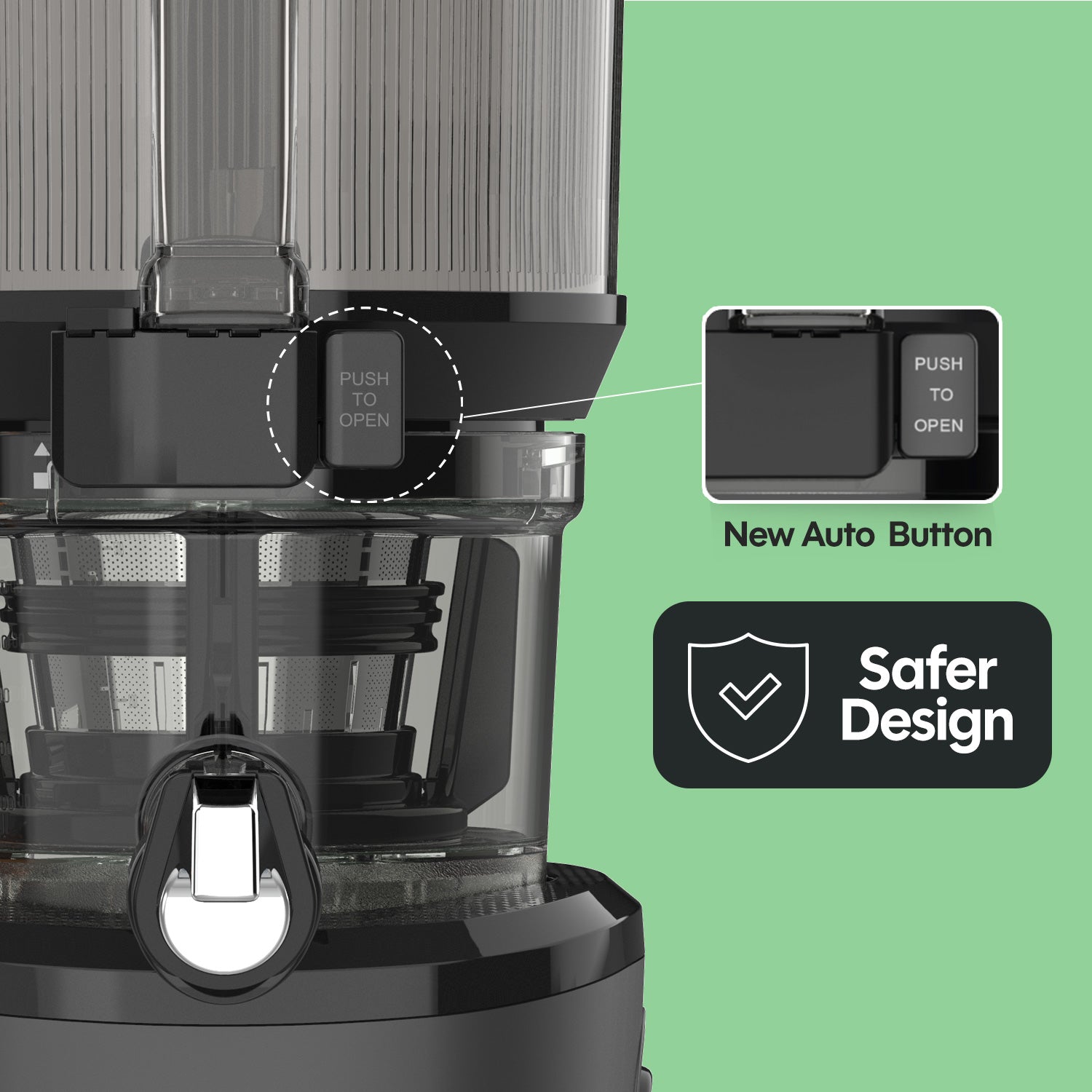 A new safety release button on the hopper handle lets you unlock and remove the hopper with a simple press and twist—making post-juicing cleanup safer and easier.