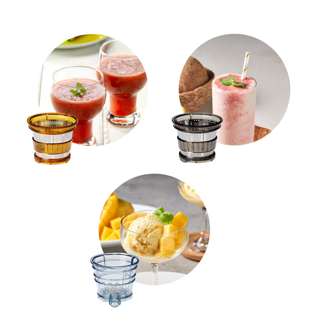 Replace the juice strainer with an blank strainer for ice cream, and with a smoothie strainer for soft smoothies.